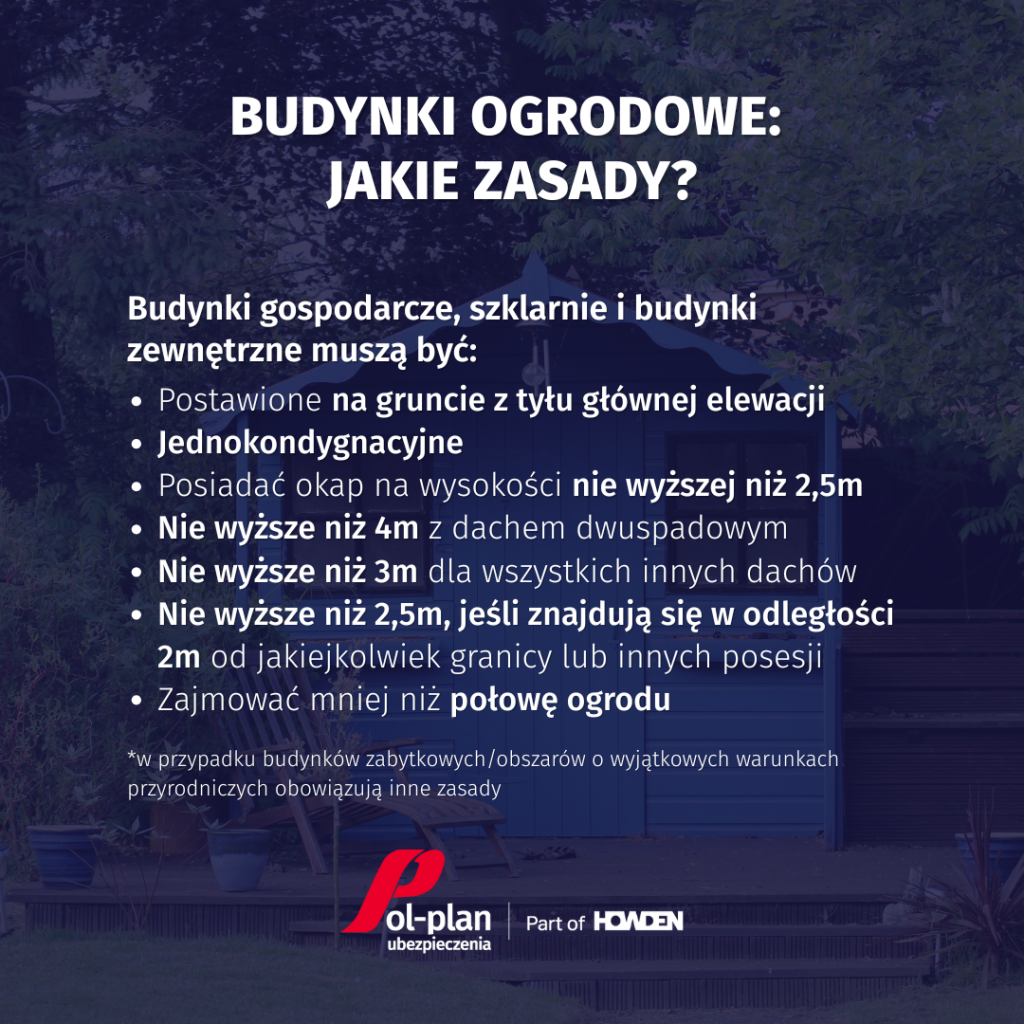 Budynek musi być oddzielony od głównego domu. Jeśli budynek ogrodowy znajduje się w odległości 2m od ogrodzenia sąsiada, to jego najwyższy punkt nie może przekroczyć wysokości 2,5m. Jeśli zaś ma stać dalej niż 2m od posesji obok, to można budować wyżej: maksymalnie do 4m z dachem dwuspadowym lub 3m dla każdego innego rodzaju dachu. W przypadku, gdy konstrukcja ma się znaleźć w odległości mniej niż 1m od ogrodzenia, to trzeba będzie wcześniej porozmawiać z sąsiadem.