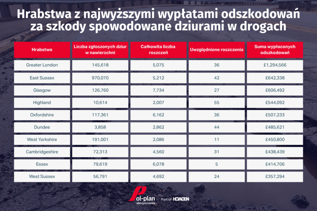 Źródła: The Independent, Department for Transport, The Mirror, Which?. Pothole data via Confused.com.